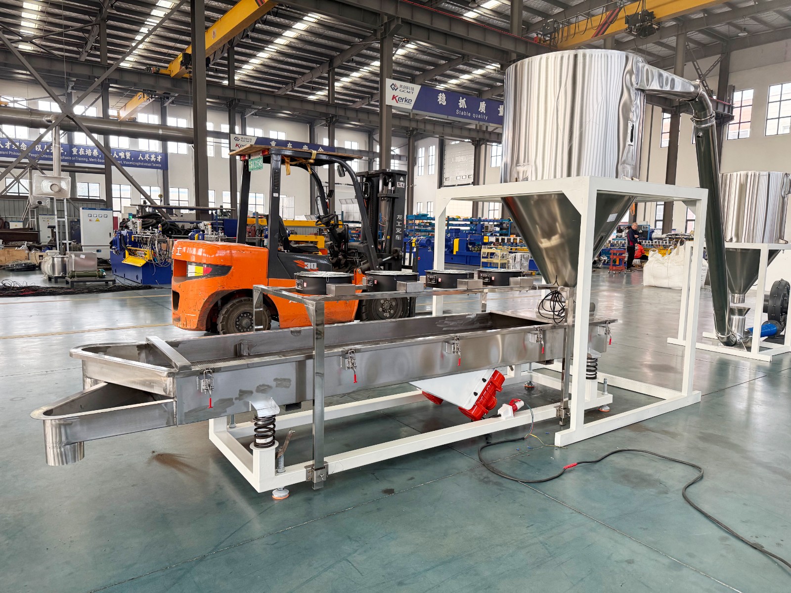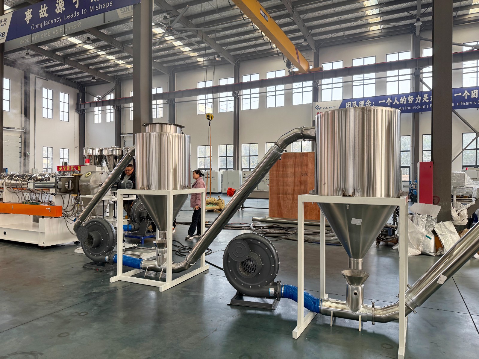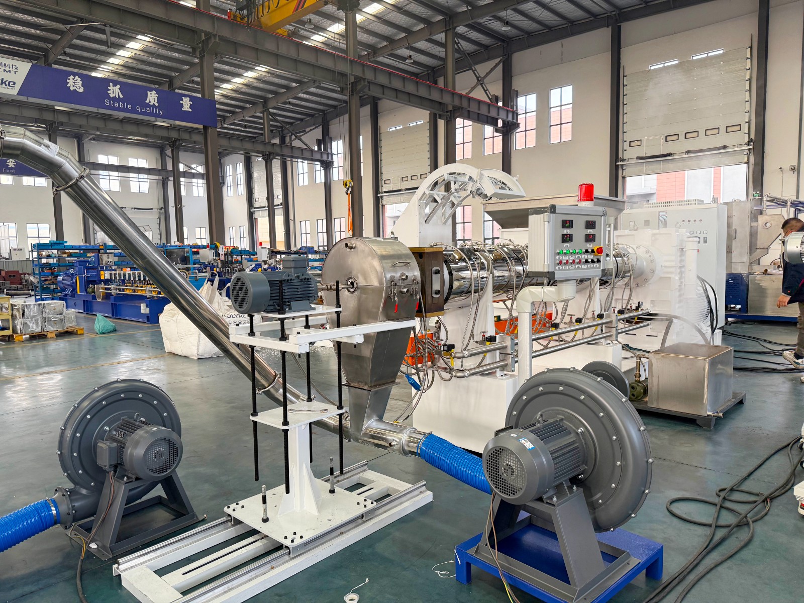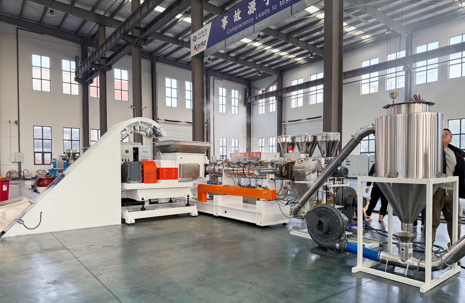 减速箱采用硬齿面、高扭矩设计,运行平稳无噪音,螺杆根据物料特性特殊设计,螺杆和机筒采用优质氮化钢或双合金材质,大大增加设备使用寿命。机筒上采用真空排气或自然排气口的设计,能在生产过程中将水分,废气排走,使出料更稳定,颗粒更结实,成品颗粒外观更漂亮。